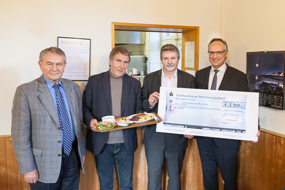 So zum Beispiel die Instandsetzung des defekten Kühlhauses. Ein Kühlaggregat war ausgefallen und musste repariert werden. Im Kühlhaus werden die frischen Zutaten für den Mittagstisch gelagert. Wenn das ausfällt, geraten die Köchinnen bei ihrer Arbeit in Not. „Darum sind wir der Schaffrath Stiftung sehr dankbar, dass sie uns so schnell und unbürokratisch mit der Spenden von 2500 Euro geholfen haben“, betont Karl Sasserath. Denn so konnten die Reparaturkosten des Kühlhauses fast vollständig gedeckt werden. „Der Mittagstisch des Arbeitslosenzentrums ist eine Institution für die Besucher. Dort bekommen sie nicht nur eine gesunde Mahlzeit, sondern erfahren montags bis freitags von 12.30 bis 13.45 Uhr eine Regelmäßigkeit, die ihnen Struktur im Alltag verleiht“, sagt Antonius Bergmann, Kuratoriumsmitglied der Schaffrath Stiftung. „Darum haben wir das Arbeitslosenzentrum gerne mit einer Spende unterstützt.“